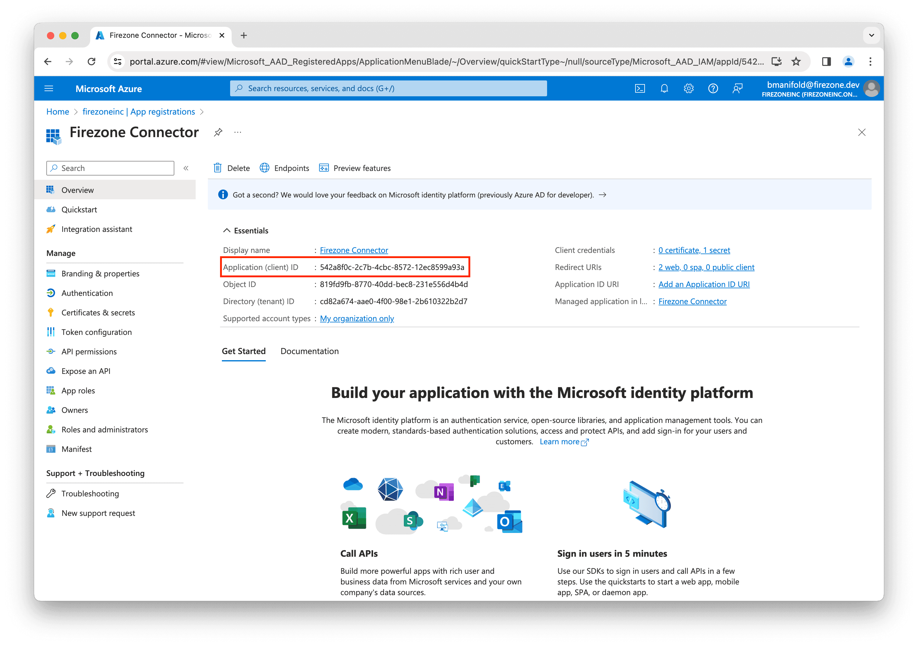 Finally, back on the app registration page, copy the Application (client) ID