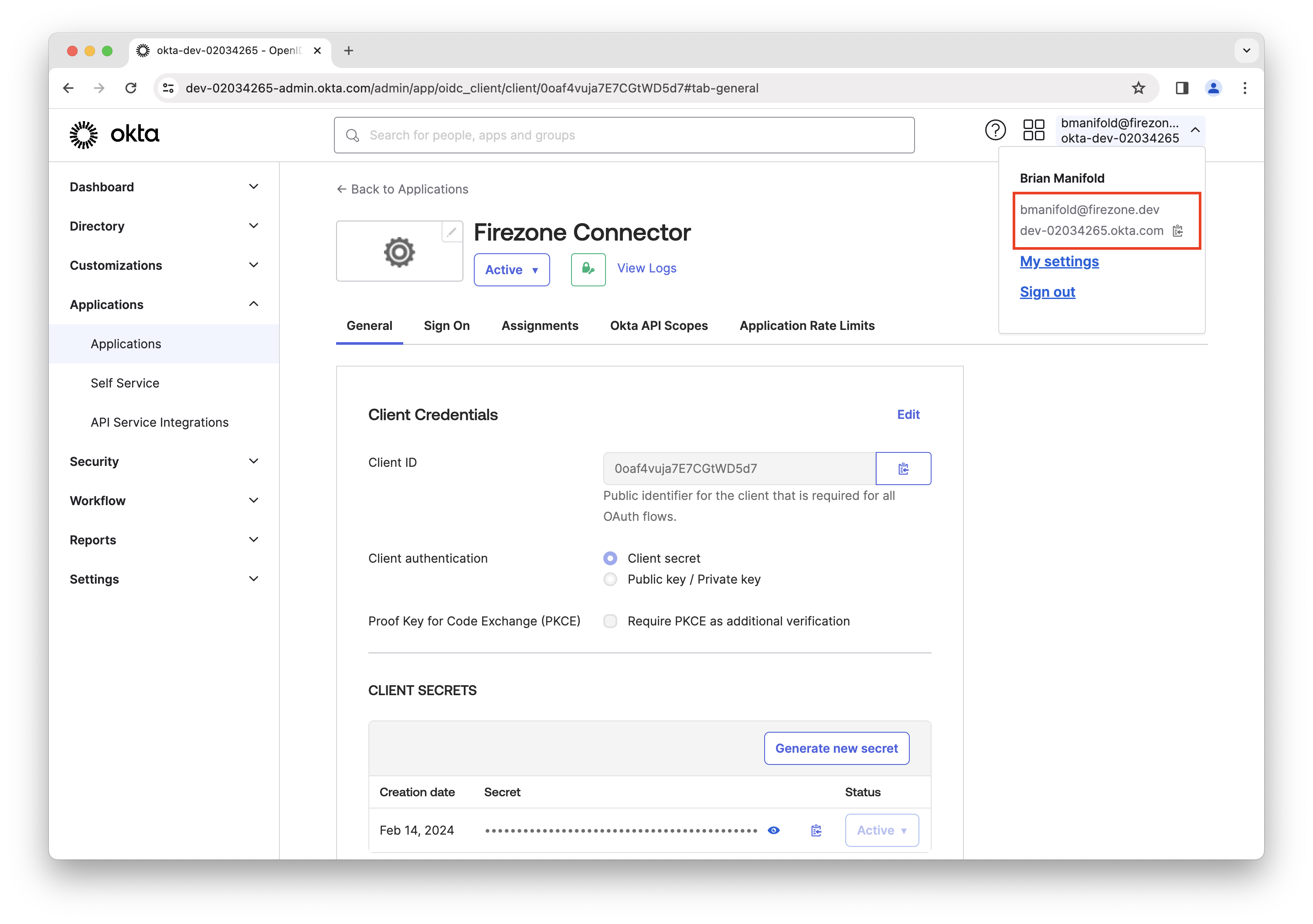 In the app integration settings in Okta, you'll find the Client ID and Client secret. Copy these values and paste them into the setup form in your Firezone admin portal.